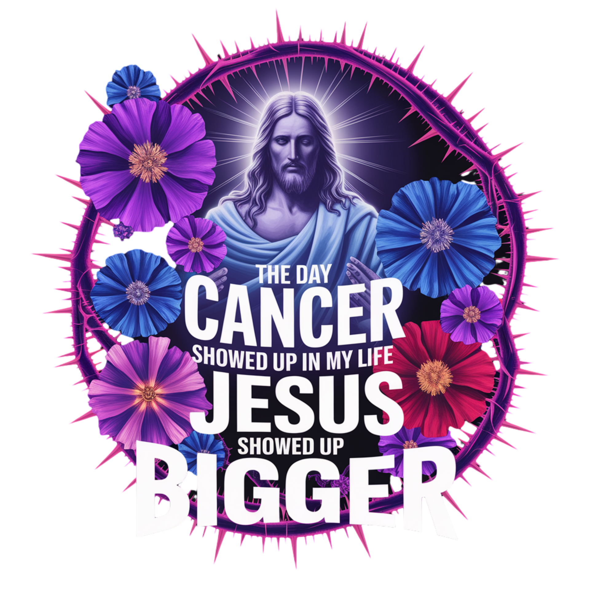The Divine Faith Armor Collection by Divine Faith Armor presents this bold Christian cancer awareness shirt. Featuring radiant purple, pink, blue, and red flowers woven into thorny vines with a hazed shadow of Christ in the background, this faith-filled design proclaims: “The day cancer showed up in my life, Jesus showed up bigger.” A powerful statement of faith, strength, and victory, this shirt is perfect for believers, survivors, and supporters alike.