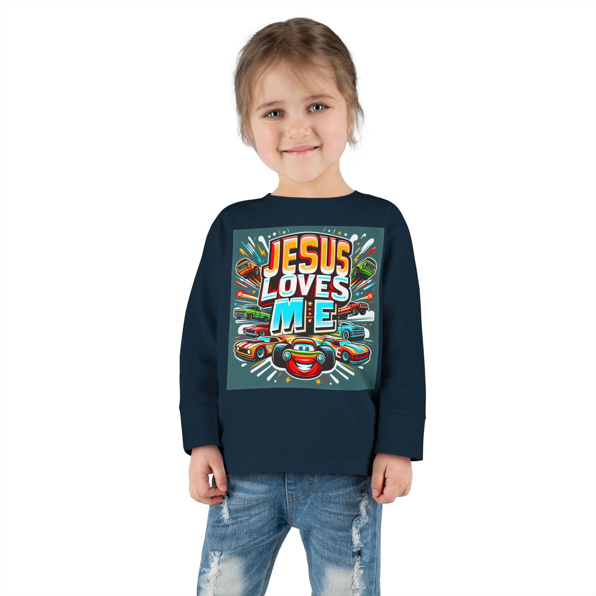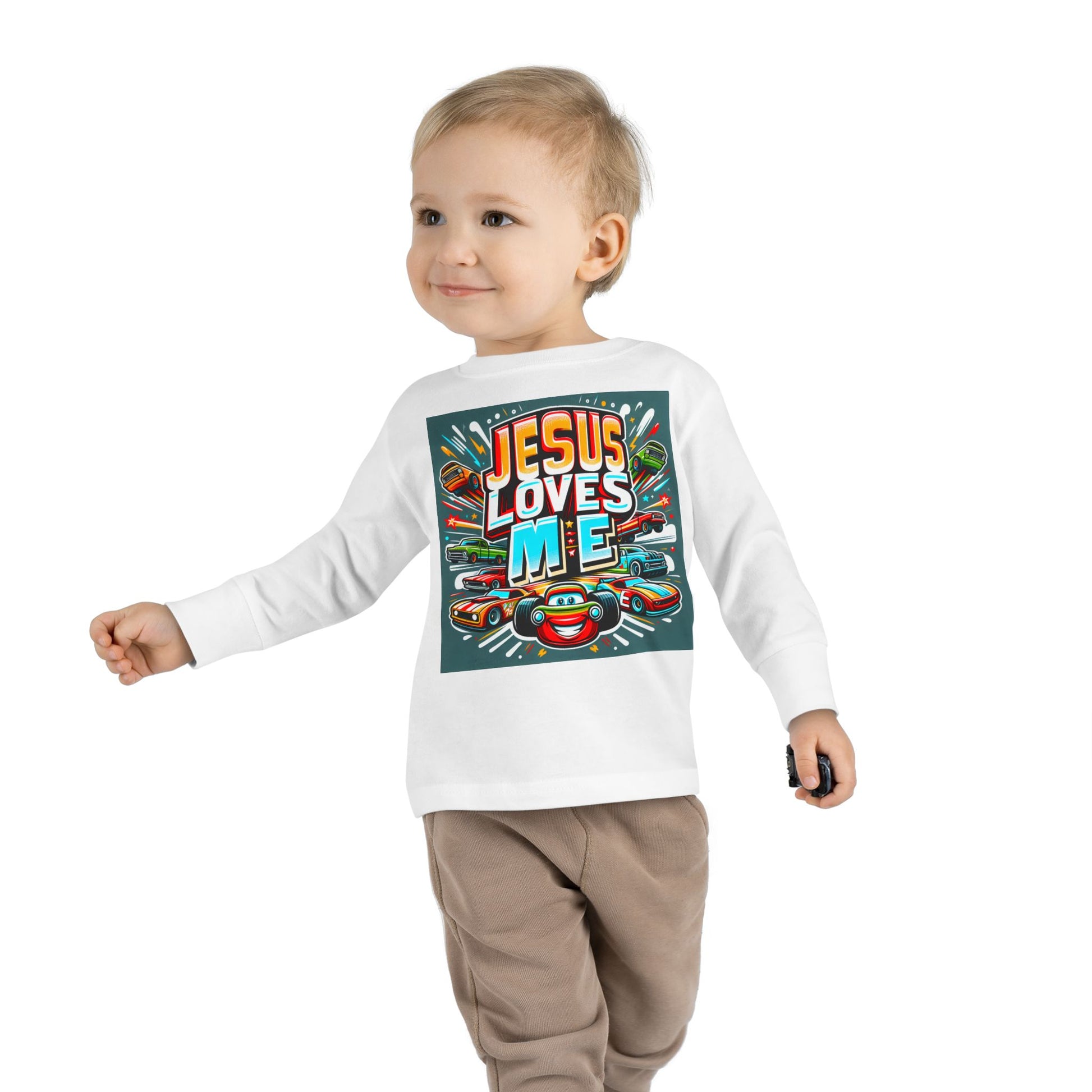 Jesus Loves Me Toddler Long Sleeve Tee Cars Design Personalized Back, Christian Kids apparel