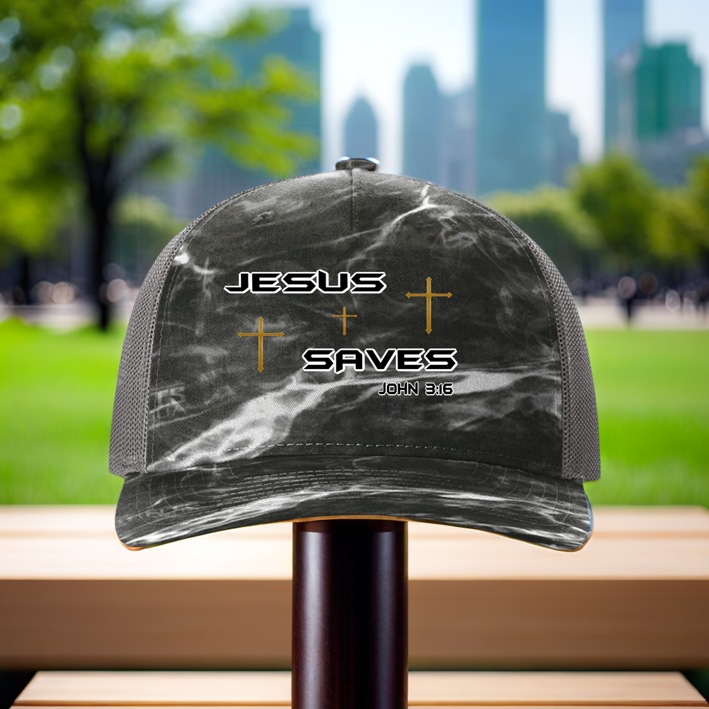 "Show your faith with the Divine Faith Armor Jesus Saves Richardson hat featuring 3 crosses in detail. This Christian trucker cap includes breathable mesh back, adjustable fit, and durable design for everyday wear. Perfect for men, women, and youth, this faith-based hat is ideal for church, outdoor activities, or as an inspirational gift. A meaningful Christian accessory that combines comfort, style, and a powerful message of hope."