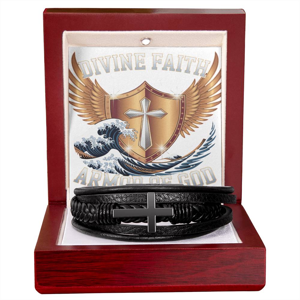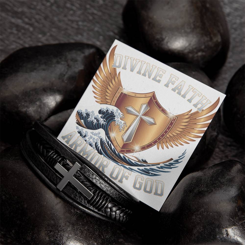 Crafted for the modern man of faith, the Divine Faith Armor™ Collection leather cross bracelet is a timeless symbol of courage, strength, and devotion. The bold stainless-steel cross set against premium leather serves as a daily reminder to walk in faith and stand firm in God’s promises—no matter the journey ahead.