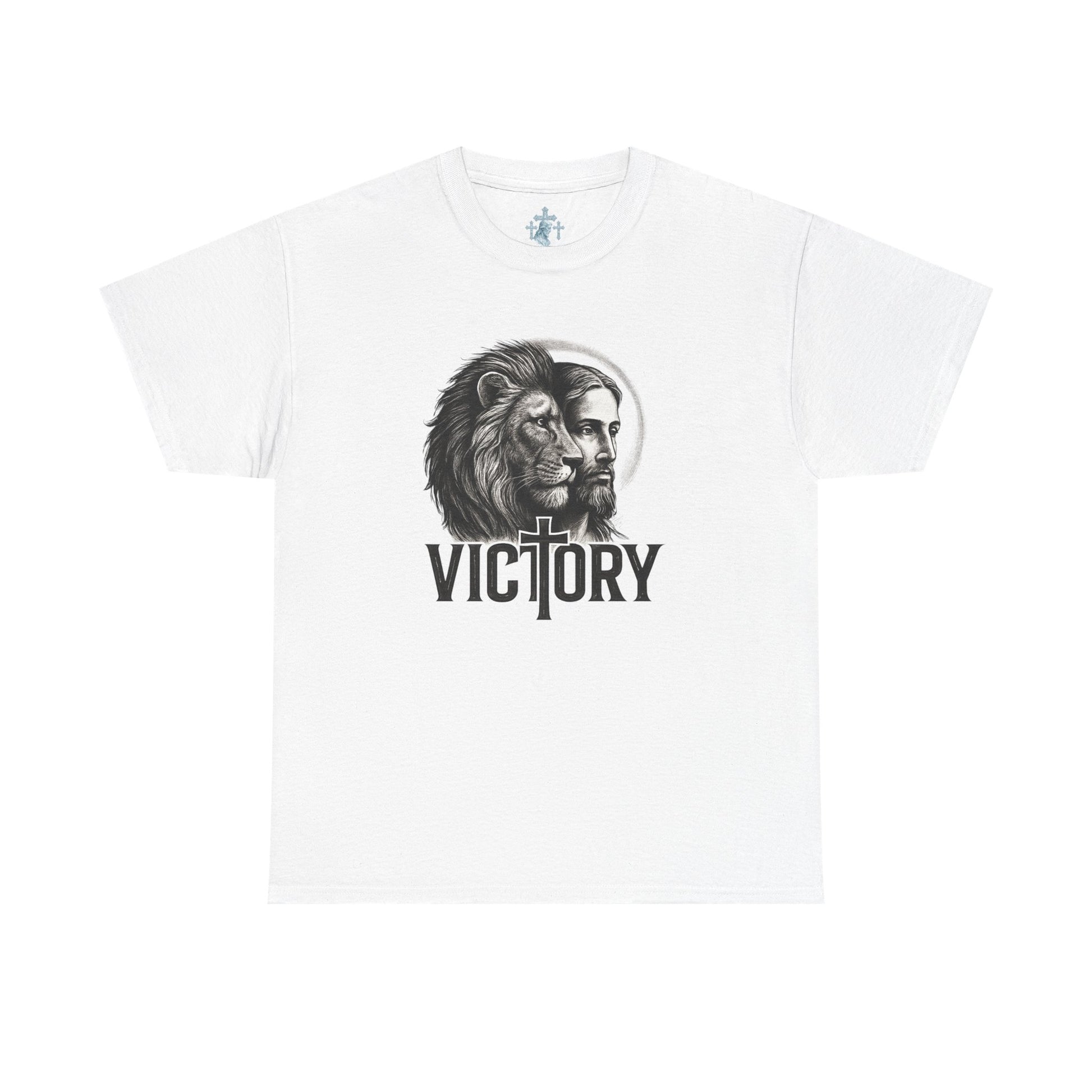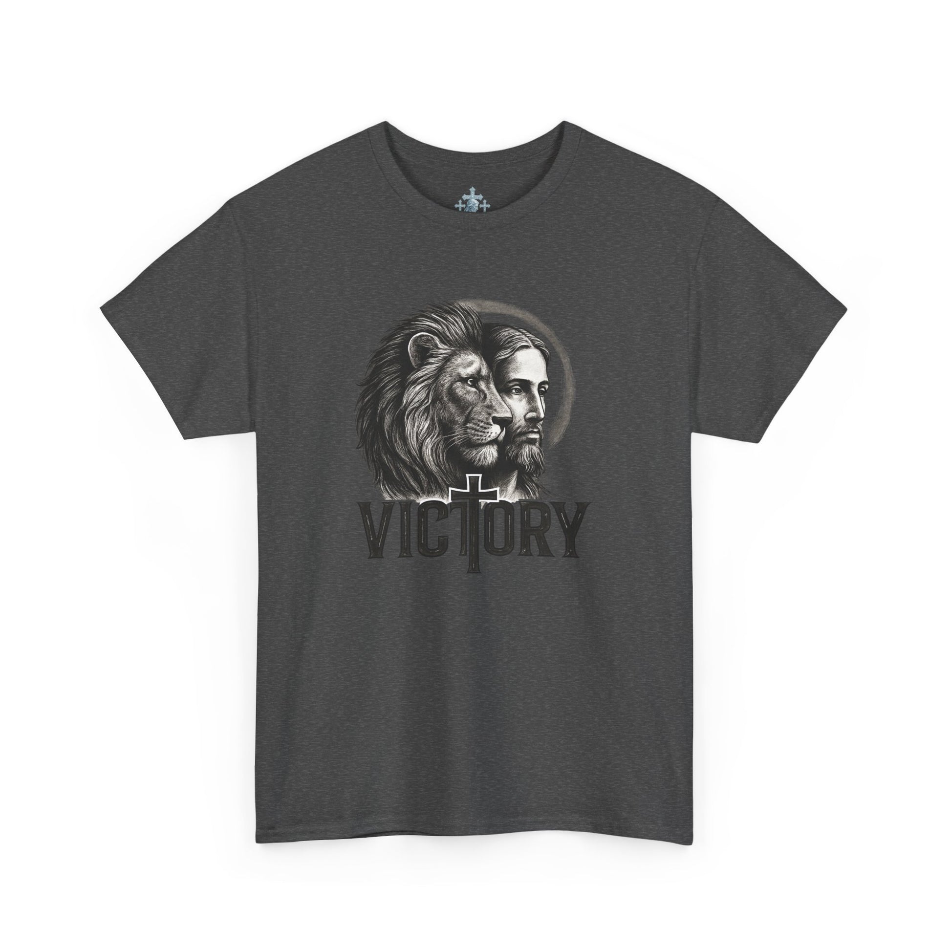 This classic crew-neck tee carries a quiet but powerful message of faith and strength. At the center is a finely detailed illustration of a lion’s resolute profile merging with a contemplative human face, surrounded by a subtle halo effect. Above it rests the bold word “VICTORY,” symbolizing courage, identity, and overcoming through faith.